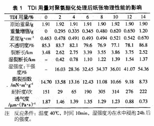 when the amount of tdi is less than 4%, the breaking length and folding strength of the paper are all decreased compared with the base paper. itself hydrogen bonding.