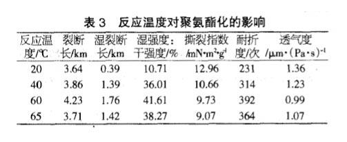 from the table below, it can be seen that the strength of tdi paper after polyurethaneization increases gradually with the increase of temperature, but since the melting point of solvent thf is 66°c, when the reaction temperature is close to the melting point of the solvent, thf volatilizes too fast and the reaction is not good. completely, so the optimum reaction temperature for polyurethaneization is 60°c.