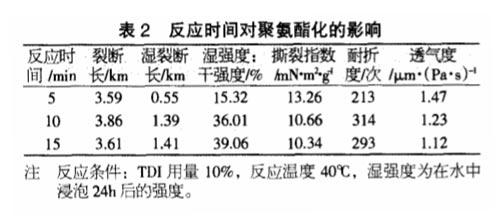 to sum up, when the amount of tdi is 10%, the reaction time is 10 minutes, and the reaction temperature is 60°c, the breaking length of the paper after polyurethaneization is increased by 21.55%, and the wet strength is 41.61% of the dry strength, far exceeding the general wet strength. according to the requirement of strong paper (the value of wet strength/dry strength is more than 15%), the folding endurance is increased by 1.6 times, and the air permeability is reduced to 52.94% of the base paper.