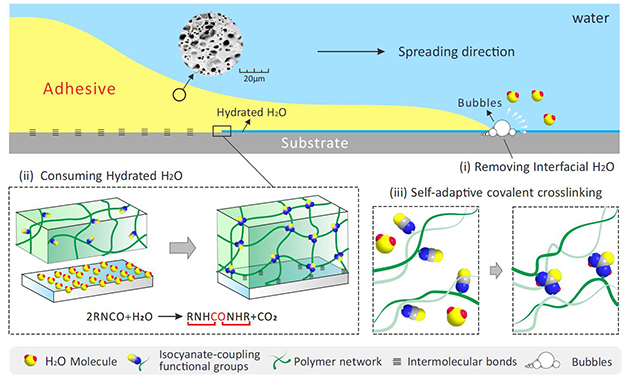 the physicochemically coupled multiscale dehydration mechanism includes the physical replacement of interfacial water at the millimeter scale by virtue of excellent wettability. through the gas film formed by the chemical reaction between the isocyanate segment in the adhesive and water, the physical shielding of interfacial water at the micron scale is realized, and the consumption of interfacial bound water is realized at the molecular scale. this series of instantaneous and spontaneous contact, spreading, wetting, and gelation processes of the underwater self-adaptively reinforced adhesive achieves a strong bond to the substrate surface.