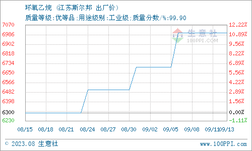 on july 29, the price of ethylene oxide in sailpan, jiangsu was flat, and the external implementation was 6,550 yuan/ton. compared with the same period last month, the chain fell by 13.25%, and fell by 9.03% year-on-year.