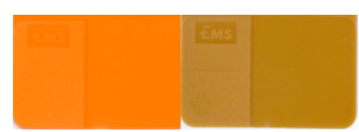 after a high temperature of 140°c, the color comparison of aimans’ pa66 v0 orange (left) and standard plastic (right)