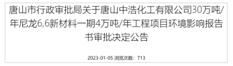 tangshan zhonghao chemical co., ltd. intends to invest 430 million yuan to build a 300,000-ton/year nylon 66 new material phase-one 40,000-ton/year project in the existing factory area, using the company’s existing adipic acid products and purchasing hexamethylenediamine as a the main raw material is to produce nylon 66 products.