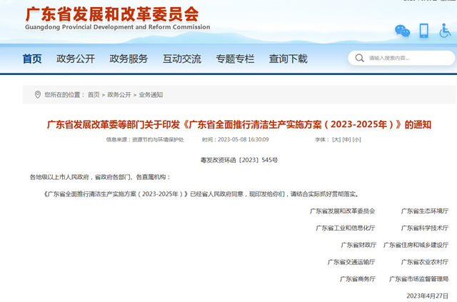 on may 8, the guangdong provincial development and reform commission website announced that the development and reform commission, the department of industry and information technology, the department of housing and construction, the department of science and technology, the department of ecological environment, the department of finance, the department of transportation, the department of agriculture and rural affairs, and the circular of 10 departments of the office, market supervision and administration bureau on printing and distributing the “implementation plan for the comprehensive implementation of cleaner production in guangdong province (2023-2025)” (hereinafter referred to as the “plan”).