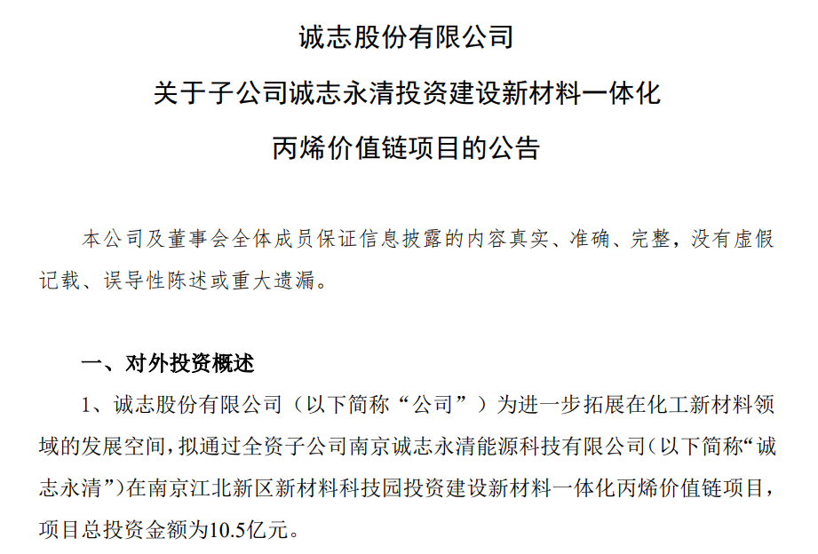 on april 3, chengzhi co., ltd. announced that in order to further expand the development space in the field of new chemical materials, the company plans to invest in the construction of new materials in nanjing jiangbei new district new material science and technology park through its wholly-owned subsidiary nanjing chengzhi yongqing energy technology co., ltd. the integrated propylene value chain project has a total investment of 1.05 billion yuan.
