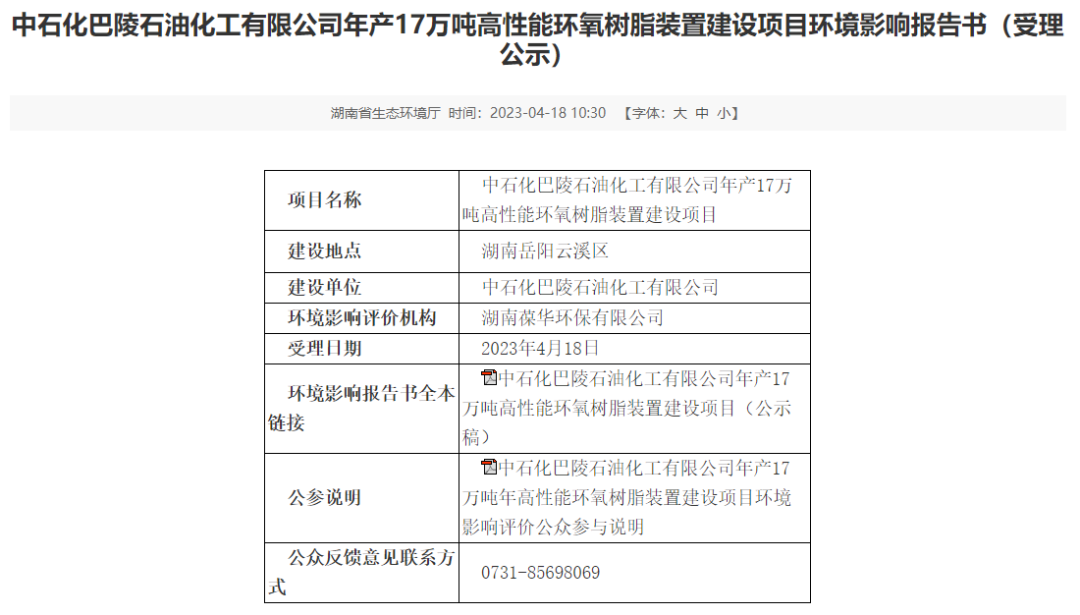 recently, the department of ecology and environment of hunan province released the environmental impact report of the construction project of sinopec baling petrochemical co., ltd. with an annual output of 170,000 tons of high-performance epoxy resin (acceptance for public notice).