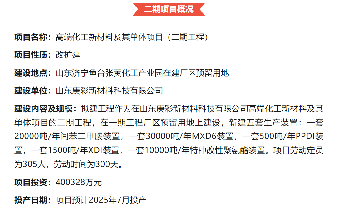 phase ii project: invest 4,003.28 million yuan, with an annual output of 630,000 tons of high-end chemical materials mxd and 10,000 tons of special modified polyurethane; at the same time, some monomers are also produced, including 20,000 tons/year of xylylenediamine, 500 tons/year of p-phenylene diisocyanate (referred to as ppdi, monomer for special modified polyurethane synthesis), 1,500 tons/year of mixed isocyanate (composed of m-xylylene dimethyl isocyanate, cyclohexane dimethyl isocyanate, cyclohexane diisocyanate composition, xdi for short, monomer for special modified polyurethane synthesis);