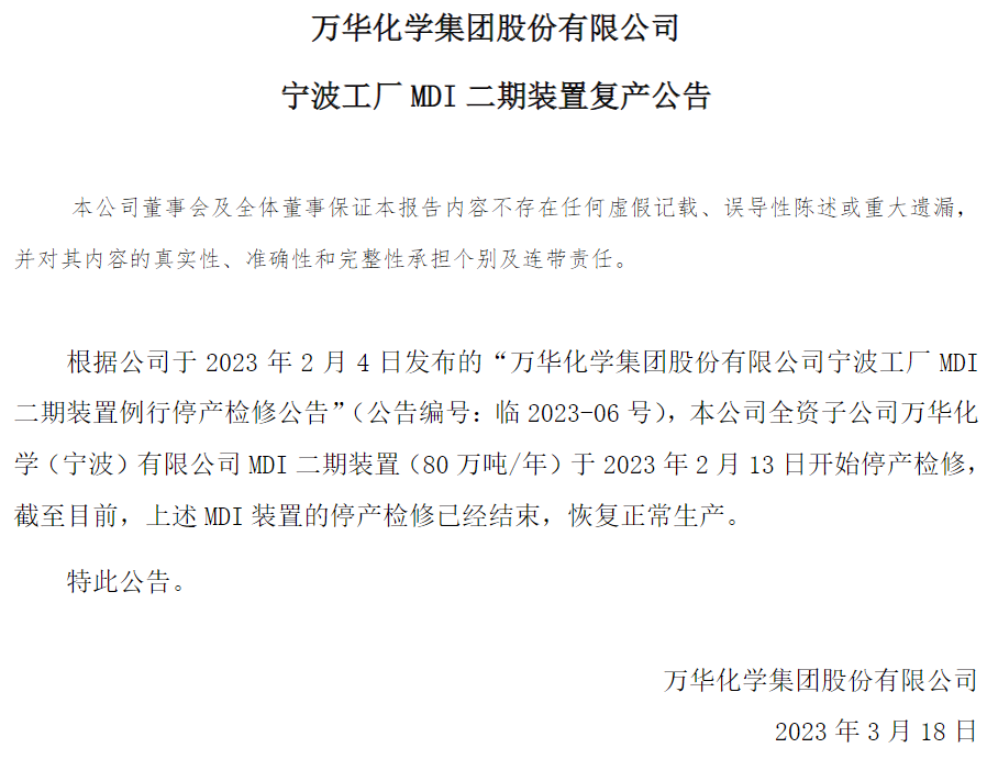 on march 17, chemical announced that its wholly-owned subsidiary chemical (ningbo) co., ltd. mdi phase ii plant (800,000 tons/year) began to stop production on february 13 maintenance, as of now, the shutn and maintenance of the above-mentioned mdi device has ended, and normal production has resumed.