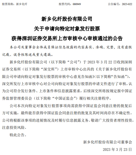 xinxiang chemical fiber recently issued an announcement stating that the company received the “notification letter of review center opinion on xinxiang chemical fiber co., ltd.’s application to issue stocks to specific objects” issued by the shenzhen stock exchange listing review center on march 22, 2023 (hereinafter referred to as the “notification letter”), the issuance and listing review center of the shenzhen stock exchange has reviewed the company’s application documents for issuing stocks to specific targets, and believes that the company meets the requirements for issuance, listing and information disclosure, and the shenzhen stock exchange will follow up. the china securities regulatory commission performs relevant registration procedures.