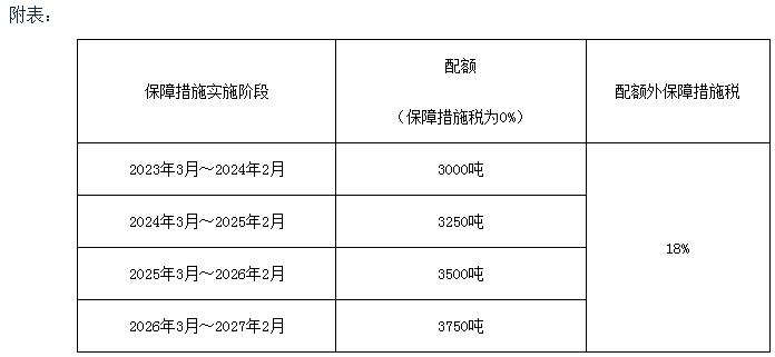 on march 10, 2023, the wto committee on safeguards released the notification of safeguards submitted by the madagascar delegation on the same day. madagascar made an affirmative final ruling on the safeguard measures for imported paints (peintures), ruling that the surge in imports of the products involved in the case has caused substantial damage or threat of damage to the domestic industry in madagascar, and it is recommended to implement safeguard measures for the products involved in the form of quotas (see the attached table for details) 18% safeguard measure tax is imposed on the products involved in the case whose import volume exceeds the quota. this case involves products under madagascar tax codes 3208 and 3209.