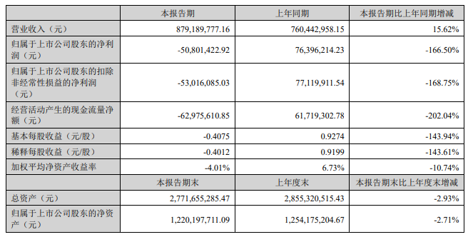 on august 23, yida shares released the 2023 semi-annual financial report, which showed that in the first half of the year, yida shares achieved operating income of 879 million yuan, an increase of 15.62% over the same period last year, but a net profit loss of 50.8 million yuan attributable to the parent, a year-on-year loss of 50.8 million yuan. a substantial decrease of 166.50%, net profit attributable to the parent company after deducting non-existing items decreased by 168.75% year-on-year; net cash flow was -62.98 million yuan, a sharp drop of 202.04% from the same period last year; basic earnings per share was -0.4074 yuan per share, which also fell sharply 143.94%.