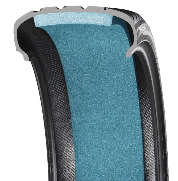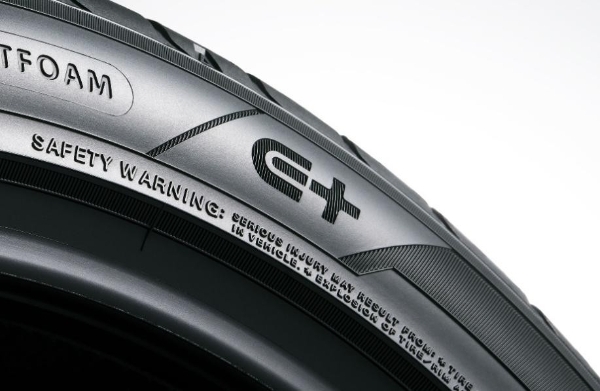 “silentfoam” and “e+” logos printed on the sidewall of the tire