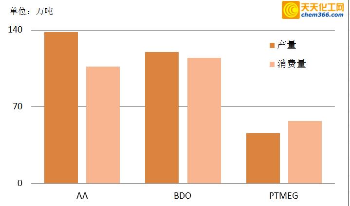 in 2018, according to the statistics of tiantian chemical network, the total domestic output of aa was 1.381 million tons; the apparent consumption increased by 5.76% year-on-year, and the growth rate dropped by nearly 5 percent. domestic production of bdo reached 1.2 million tons this year; consumption increased by 8% year-on-year, and the growth rate increased by 3.5 percentage points. in 2018, the total national output of ptmeg reached 460,000 tons, and the consumption increased by 8.4% year-on-year, and the growth rate slowed n by nearly 1 percentage point.