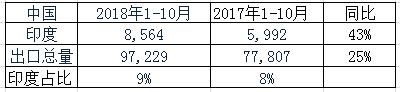 in 2018, china increased the export of pure mdi, as can be seen from customs data, 1- in october, china’s total exports of pure mdi increased by 25% year-on-year. and india, as one of the larger markets, must not be ignored. from january to october 2018, china exported less than 8,600 tons of pure mdi to india, a year-on-year increase of 43%. the rate of increase, accounting for 9% of total exports. during the period, almost every month has improved compared with the same period last year, especially in the traditional peak seasons of february and march and september after the rainy season, sales have almost doubled compared with 2017.
