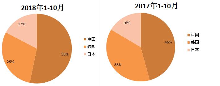 from january to october 2018, china, japan and south korea exported a total of 16,000 tons of pure mdi to india , an increase of 23% year-on-year, accounting for 7% of the total export volume. among them, china is the main exporter, accounting for more than half of the market share, an increase compared to last year. followed by south korea, accounting for less than 30% of the share, lower than the same period last year. japan accounted for 17% of the share, which was basically the same as the same period last year.