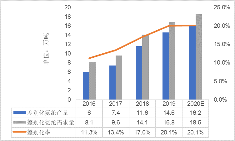 figure 4 2016-2020china’s differentiated spandex production, demand and differentiation rate
