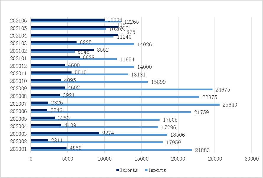 figure1 2020-2021年中国other diols (includingbdo) monthly import and export volume (unit: ton)