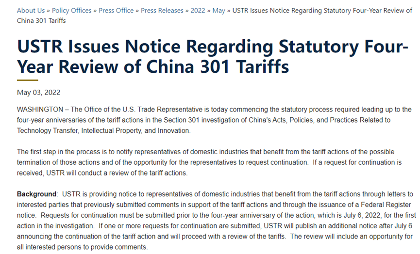 before may 3, 2022, the united states the office of the trade representative (ustr) issued a statement stating that the two actions to impose tariffs on chinese imports to the united states based on the results of the so-called “301 investigation” four years ago will be implemented on july 6 and 8 respectively this year. due on 23rd. from now on, ustr will start the relevant review procedures. this review process will take a “two-step process”. the first step is that representatives of domestic industries in the united states that benefit from the tariffs imposed on china have the right to apply to ustr to maintain the tariffs before july 5 and august 22, respectively. tariff, the second step is for ustr to review these applications and accept public comments to make a final administrative decision. ustr will review the relevant tariffs based on the application, and these tariffs will be maintained during the review period.
