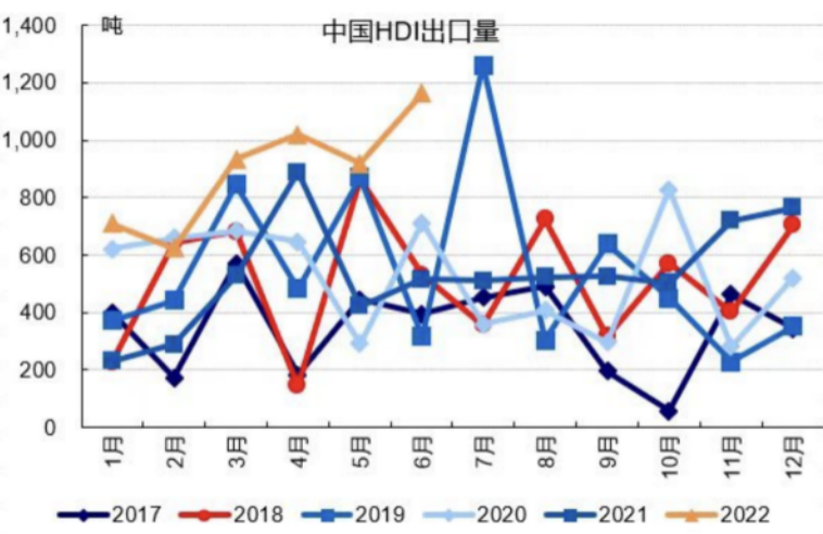 according to customs data, 2022year1-6monthly china exporthdi(hexamethylene diisocyanate)5368tons, year-on-year growth 85.45% , total export3779 10,000 us dollars, a year-on-year increase200.40%.