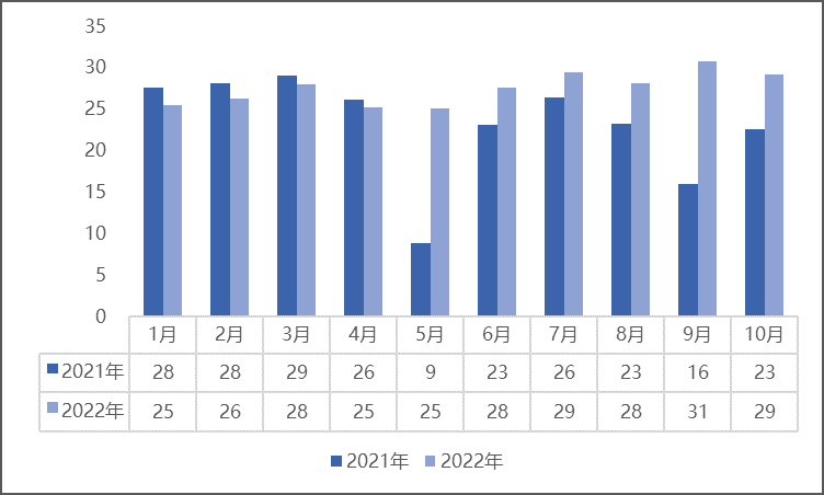 figure 2: indian car production from january 2021 to october 2022 (unit: 10,000 units)