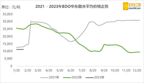 2022the overall bdo market price in 2022 showed a trend of weak decline, and the operating range of the bdo market in 22 years was 9375-27940 yuan/ton. it opened at 26,723 yuan/ton at the beginning of the year and ended at 9,375 yuan/ton at the end of the year, a year-on-year growth rate of -69.7% from the end of 21. at the beginning of 22, the bdo market continued its high trend for 21 years. however, due to the impact of the economic environment, from the end of march to august, due to the continued sluggish nstream demand, nstream construction continued to decline, especially the three major nstream ptmeg-spandex, pbt , the gbl-nmp industry chain has mostly entered the off-season of demand, and the bdo market has been falling all the way. although there was a recovery until the end of the year, the overall trend of the market in 22 years has been basically determined. as of the end of december 22, with the easing of the epidemic policy and the limited supply on the market due to the low start-up of the supply side, the bdo market has rebounded to about 9,700 yuan/ton.
