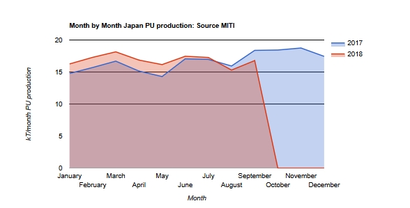 in september 2018, japan produced a total of 16,800 tons of polyurethane, compared with 18,400 tons in the same period last year, a decrease of 1,590 tons.