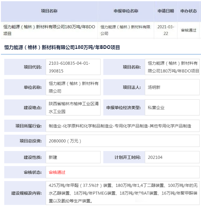 recently, the public information of shaanxi government service network shows that hengli energy (yulin) new material co., ltd.’s 1.8 million tons/year bdo project has been reviewed and approved.