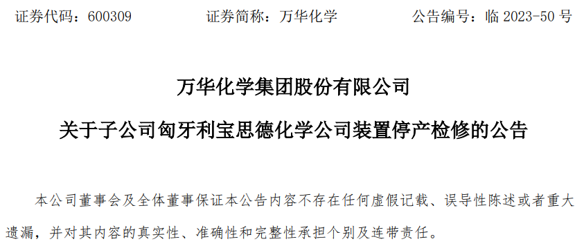 according to the announcement, the tdi plant of hungary borsod chemical company, a subsidiary of chemical ( 250,000 tons/year) will start to stop production for maintenance on july 15, 2023, and the maintenance is expected to be about 30 days.