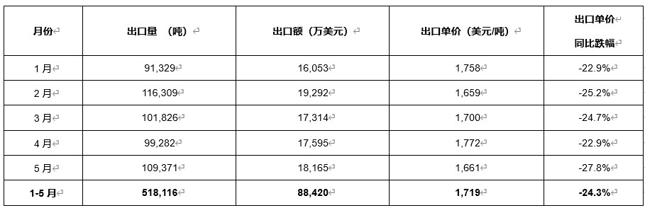 although the cumulative export volume of china’s polymeric mdi in the first five months has achieved double-digit growth, the average export price in each month has shown a year-on-year decline, and the decline in may has expanded. the decline in overseas export prices was mainly affected by the overall weak domestic market prices during the same period.