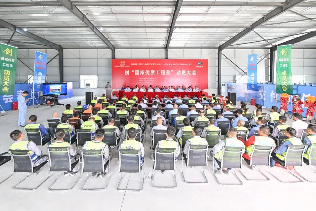 at 5:30 p.m., xinjiang shuguang lvhua biotechnology co., ltd.’s annual production of 100,000 tons of bdo and 120,000 tons of pbat project created the “national quality engineering award” mobilization meeting, held in tiemenguan city, second division of xinjiang production and construction corps held.