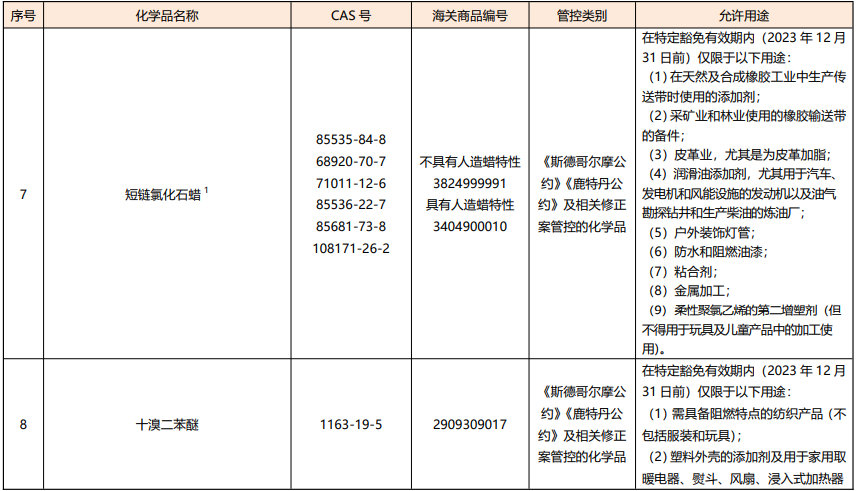 3. update the substance information and control requirements of short-chain chlorinated paraffins. according to the relevant provisions of the “amendment” and “list”, the chemical abstracts service registration number (cas number) and its permitted use of short-chain chlorinated paraffins have been updated.
