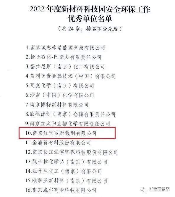 recently, nanjing hongbaoli polyurethane co., ltd. won the title of “2022 new material science and technology park safety and environmental protection excellent unit” in nanjing jiangbei new district. another honor after the unit”.