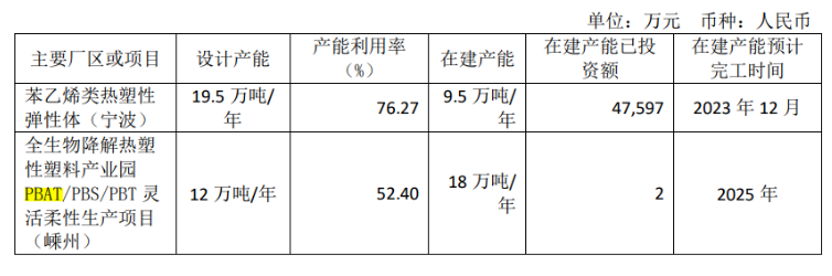 according to the annual report data, the capacity utilization rate of the 120,000-ton/year fully biodegradable thermoplastic industrial park pbat/pbs/pbt flexible production project (shengzhou) is 52.40%. in addition, the company still has 180,000 tons/year of production capacity under construction, and the expected completion time is 2025.
