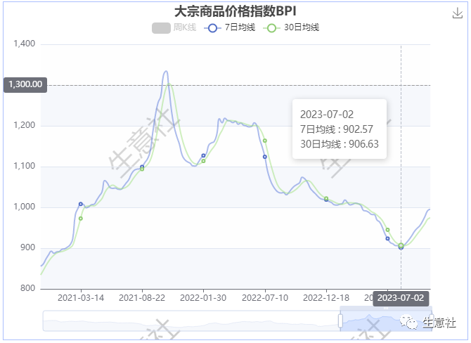 according to the sunsirs commodity price index bpi, since 2023/7/2, the 7-day moving average has crossed the 30-day moving average and started to rise. trend, the current two moving averages continue to rise in the same direction, indicating that bpi has entered an upward channel, which also reflects that the macro economy will rise.