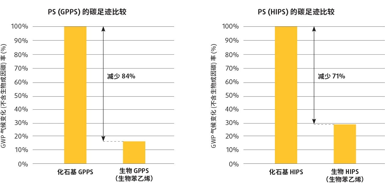 gpps, both products use styrene monomer replacement materials. the product carbon footprint (pcf) of both products is reduced by 71% and 84% respectively compared to baseline fossil-based materials.