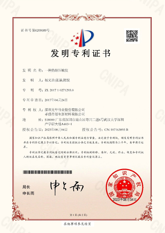 recently, the production technology of “bio-based biodegradable hot melt pressure-sensitive adhesive” independently developed by shenzhen guanghua weiye co., ltd. and its subsidiary xiaogan yisheng new materials co., ltd. passed the national knowledge approved by the intellectual property office, obtained national invention patent authorization. at present, esun has applied for nearly 100 national patents and obtained more than 60 patents, mainly invention patents.