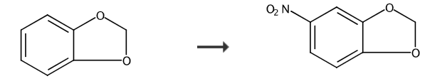in the air, add compounds benzo[d][1,3]dioxolane 1a (0.5mmol, 61mg), i2 in sequence to a 10ml sealed pressure tube. o5(2.5mmol,835mg), nano2(2.5mmol,173mg), 2ml ch3no2and 0.1ml water. react for 2 h under vigorous magnetic stirring at 15°c. tlc followed the reaction. when the reaction is completed, add anhydrous na2so3 to quench the reaction. first add 15 ml of saturated na2s2o3 to the reaction solution, and use ch2cl2(15ml×3) wash the aqueous phase, combine the organic phases, dry with anhydrous na2so4, filter, evaporate the solvent of the filtrate under reduced pressure, and column layer after analysis (ethyl acetate: petroleum ether = 1:5), 70 mg of 1,2-methylenedioxy-4-nitrobenzene was isolated as a light yellow solid, with a yield of 84%, m.p. 145~147°c; 1 h nmr (300mhz, cdcl3) δ: 7.90 (dd, j=8.6, 2.3hz, 1h), 7.67 (d, j=2.3hz, 1h), 6.87 (d ,j=8.6hz,1h),6.15(s,2h); ms(ei)m/z: calcd for c7h5no4[m]+168.03, found 168.00.