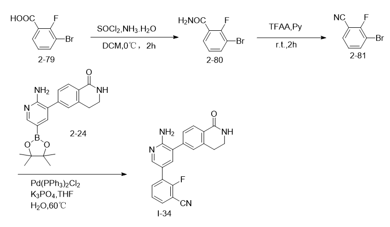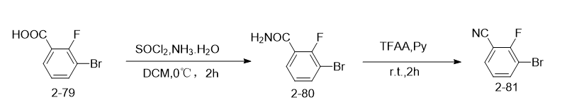 3-bromo-2-fluorobenzamide (2-80, 260 mg, 1.2 mmol), tfaa (471 mg, 2.4 mmol) and pyridine (py) (474 mg, 6.0 mmol) were dissolved in diox the mixture in alkane (5 ml) was stirred at room temperature for 4 h. after the reaction was completed, the resulting mixture was washed with water and extracted with ethyl acetate (150 ml × 3). the combined organic phases were concentrated under reduced pressure, and the resulting residue was purified by silica gel chromatography (petroleum ether/ethyl acetate = 1/1) to obtain intermediate 2-81 (white solid, 100 mg, 42% yield).