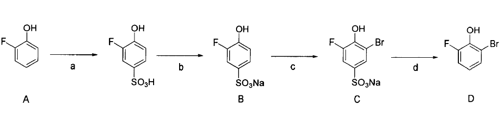 1) synthesis of sodium 3-fluoro-4-hydroxybenzenesulfonate (b) (steps a and b, sulfonation reaction):