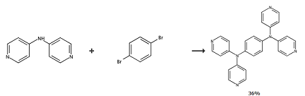 place 4,4′-bipyridylamine (4.28 g, 25 mmol), 1,4-dibromobenzene (2.36 g, 10 mmol), anhydrous potassium carbonate (4.8 g, 34.4 mmol), copper sulfate ( 994 mg, 6.2 mmol), 18-crown-6 (220 mg, 0.83 mmol) and diphenyl ether (35 ml) were added to the three-necked flask, heated at 200°c under nitrogen for 3 days, and then 1,4- dibromobenzene (7 g, 29.7 mmol). the reaction mixture was stirred at 200°c for another day. after the reaction was cooled, dichloromethane and water were added to dissolve the solid, and the organic phase was washed with distilled water to neutral ph and then dried over sodium sulfate. after removal of the solvent, the residue was purified by silica gel chromatography to obtain the following two compounds as colorless solids: (4-bromophenyl)-bis(4-pyridyl)amine (2.92 g) and n1,n1,n4,n4 – tetrakis(pyridin-4-yl)benzene-1,4-diamine (2.1 g, 40.8% based on 4,40-dipyridylamine). 1hnmr (cdcl3, 500mhz): δ = 8.49 (d, j = 6.0hz, 8h, pyridyl-h), 7.23 (s, 4h, phenylene base-h), 7.01 (d, j = 6.0hz, 8h, pyridyl-h). anal. calcd (%) for c26h20n6: c, 74.98; h, 4.84; n, 20.18. found: c, 74.57; h, 4.71; n, 20.06. ir (kbr pellet, cm-1 ): 1592(s), 1577 (vs), 1498(s), 1488(s), 130(m), 1304(s), 1277(vs), 1217(m), 993(m), 813(m) ), 740(w), 624(m), 542(m).