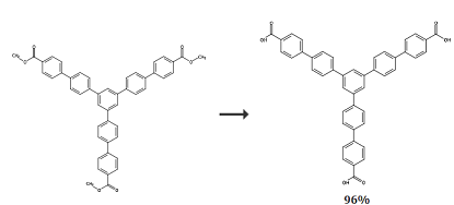 1,3,5-tris(4′-carboxy[1,1′-biphenyl]-4-yl)benzene was placed in a 1 l round-bottomed flask equipped with a magnetic stirring rod. 4″-(benzene-1,3,5-triyl-tris(phenyl-4,1-diyl)benzene)tribenzoate (2.00 g, 2.82 mmol), 2.2 g naoh, thf, water and methanol (200, 80 and 50 ml respectively) were mixed and the mixture was stirred at room temperature for 2 days. the solution was evaporated under vacuum. acidified with 3 m hcl. the product was collected by filtration as a white solid and treated with dichloromethane and methanol. wash, then vacuum dry overnight (1.80 g, 96%): mp 326 °c. 1h-nmr (dmso-d6, 400 mhz) δ 13.07 (br, 3h) 8.07 (d, 6h, j = 8.0hz), 8.06 (s, 3h), 8.05 (d, 6h, j = 8.0hz), 7.91 (d, 6h, j = 7.6hz), 7.89 (d, 6h, j = 7.2hz); 13c-nmr (dmso-d6, 100 mhz) δ168.0, 144.6, 141.9, 140.7, 139.2, 130.9, 130.6, 128.8, 128.4, 127.6, 125.3; ft-ir (kbr, 4000- 400 cm ), 1276 (m), 1177 (m), 1118 (m), 1003 (m), 824 (s), 773 (s); maldi-tof ms (m/z) [m] + 666.2976, 666.2042 (calculated).