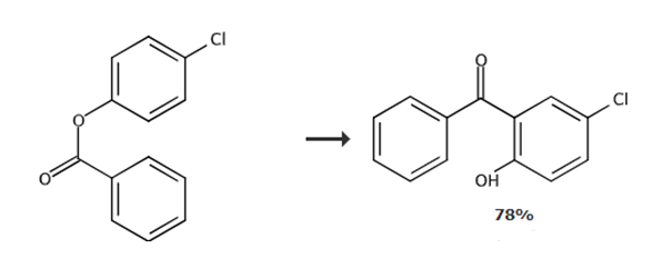 add 4-chlorophenyl benzoate (23.3 g, 100 mmol) and anhydrous aluminum chloride (16.7 g, 125 mmol, 1.25eq) into a 250 ml round-bottomed flask. the melted reaction mixture was slowly stirred at 160-180°c for 3 hours. the mixture was cooled to room temperature. quench the mixture with ice-cold water (170 ml) and 10% aqueous hydrochloric acid solution (85 ml). add dichloromethane (200 ml) to the mixture and shake well until completely dissolved. transfer the solution to a separatory funnel, separate the aqueous layer from the organic layer, and extract twice more (2×200 ml). the combined organic layers were concentrated under reduced pressure to approximately 150 ml. transfer the mixture to a separatory funnel and extract the mixture with 2.5% sodium hydroxide solution (4×250 ml). acidify the combined alkaline aqueous layer with 10% sulfuric acid (ph≈1, approximately 300 ml), filter out the crude precipitate, and dry the filtrate in air. after purification with activated carbon, the crude crystals were crystallized from methanol to obtain 2-hydroxy-5-chlorobenzophenone.