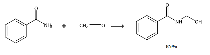 to a solution of benzamide (70.0g, 0.58mol), add a 40% solution of formaldehyde (45.0g, 0.60mol) and potassium carbonate (2.00g, 14.5mmol) in water (70ml). this was heated on a water bath until a clear solution formed, and then crystallized. recrystallization from dilute ethanol gave n-hydroxymethylbenzamide 6282-02-6 (79.4 g, 85%) as a crystalline solid, mp 104°c.