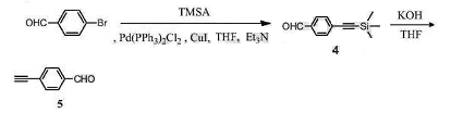 dissolve p-bromobenzaldehyde (1.85g, 10mmol) in 15ml of anhydrous thf, add trimethylsilyl acetylene (1.47g, 15mmol), bistriphenylphosphine palladium dichloride (70mg, 0.1 mmol), copper iodide (38 mg, 0.2 mmol), and 5 ml triethylamine. react at 40°c for 2 hours. spin thf to dryness and perform column purification using pe and dcm (volume ratio 2:1) as eluents to obtain 2.0 g of compound 4 as a white solid. the yield is 99%.