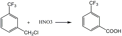 method 1: a method for preparing m-trifluoromethylbenzoic acid, which uses m-trifluoromethylbenzyl chloride as raw material and oxidizes it with nitric acid with a concentration of 60-70% by weight at 100-110°c. reaction, cooling and filtration, the m-trifluoromethylbenzoic acid product is obtained.