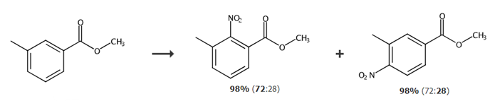 add 4.8ml 65% nitric acid (0.07mol) into a 100ml round-bottom flask, add 7.6ml (0.08mol) acetic anhydride dropwise, and finish the dripping. after 0.5h reaction, add 7.6ml acetic anhydride, 5.4ml acetic acid, 3.0g3 -after mixing, methyl methyl benzoate (0.02mol) was slowly added dropwise to the reaction system. the above operations were all performed under ice bath conditions. after the dripping is completed, raise the temperature to 30°c and react for 3 hours. after stopping the reaction, steam out acetic anhydride, nitric acid and the generated glacial acetic acid. pour the concentrated solution into ice water and stir. a yellow solid will precipitate. add 20ml of ethyl acetate to adhere to the solution. the product on the wall of the bottle was dissolved, separated and concentrated to obtain 3.83g of light yellow liquid with a yield of 98.21%. after hplc analysis, the content ratio of methyl 3-methyl-2-nitrobenzoate to methyl 3-methyl-4-nitrobenzoate was 72:28.