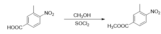 add 300g 3-methyl-4-nitrobenzoic acid (1.66mol) and 1000ml methanol into a dry 3l three-necked flask equipped with a reflux condenser and a thermometer, and make a simple exhaust gas absorption device on the reflux condenser. the absorption liquid is naoh aqueous solution. under electromagnetic stirring, add 100g of thionyl chloride (0.85 mol) drop by drop using a constant pressure dropping funnel. control the temperature of the reaction solution during the dropping process to be between 30-40°c. at this time, the reaction solution will be a milky white solution. after about 45 minutes, the dropwise addition is completed, and the temperature is raised to 60°c. at this time, the reactant becomes a yellow clear and transparent solution. stir and reflux the reaction for 2 hours at this temperature, stop heating, and slowly cool the reaction solution. when it reaches 50°c, a large amount of solid precipitates. continue to cool n to 30°c, add 1000ml of water to the reaction solution, stir for about half an hour until no more gas is released, filter the reaction, and wash the obtained filter cake with 100ml×3 water, and dry it at 40°c to obtain 314g of yellow powder. solid, yield 97.2%, m.p. 80~82°c.