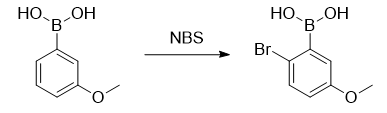 under an argon atmosphere, add 3-methoxyphenylboronic acid (9.12g, 60.0mmol), triphenylphosphine sulfide (932mg, 6.00mmol), and dichloromethane (200ml) into a 300 ml eggplant-shaped flask. ), stir it to form a homogeneous solution. n-bromosuccinimide (13.0 g, 72.0 mmol) was added thereto, and the mixture was stirred at room temperature for 2 days. a saturated sodium thiosulfate aqueous solution was added to the reaction mixture to terminate the reaction, and then extracted with dichloromethane (100 ml × 3). the combined organic layers were washed with saturated brine and then dried over sodium sulfate. after filtration, it was concentrated under reduced pressure to obtain crude product. it was purified by silica gel column chromatography (290g, n-hexane/acetone = 1/1) to obtain 2-bromo-5-methoxyphenylboronic acid (8.45g, 36.6mmol), yield 61.0%).