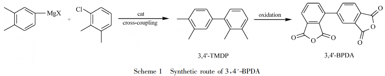 li yuhan et al. reported a method for efficiently preparing 3,4′-biphenyltetracarboxylic dianhydride (3,4′-bpda) using halogenated o-xylene as raw material through cross-coupling, oxidation and other processes. method. as shown in schmeme1, 4-halo-o-xylene reacts with mg to prepare grignard reagent, and then cross-coupling is performed under transition metal catalysis to prepare 2,3,3’4′-tetramethylbiphenyl (3,4′ -tmdp). finally, the target compound 3,4′-biphenyltetracarboxylic dianhydride (3,4′-bpda) was obtained by transition metal catalyzed oxidation.