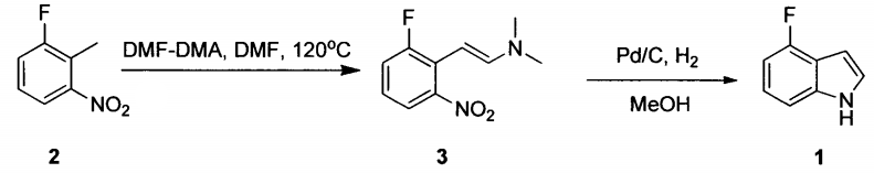 place compound 3 (2.1g, 10mol) in a 50ml reaction flask, add methanol (10ml), add palladium carbon (5%, 300mg) with stirring at room temperature, and heat up to react with hydrogen gas overnight. after tlc monitoring, the reaction was terminated, filtered, and the solvent was evaporated under reduced pressure. the residue was purified with a silica gel column to obtain compound 1, 4-fluoroindole (0.5g), yield: 37%.